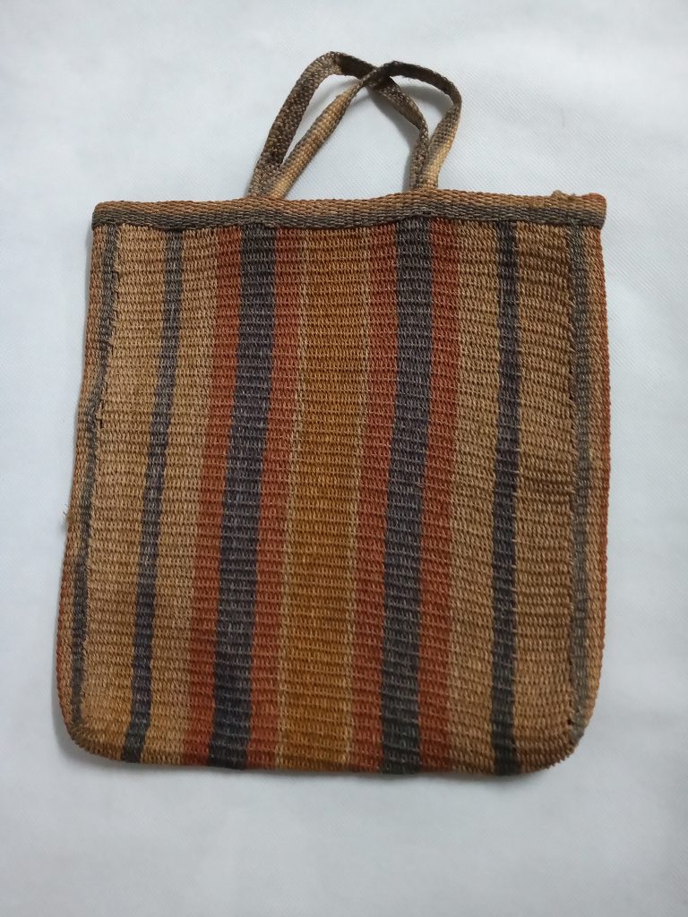 Tecido com fio de algodão tingido nas cores vermelha e azul com anilina. Padrões geométricos (tecido sarjado) e acabamento em franja (reproduzido em Arte Kadiwéu, 1950 e reeditado...