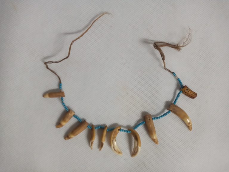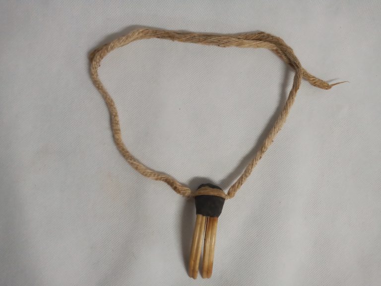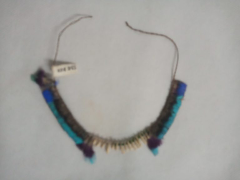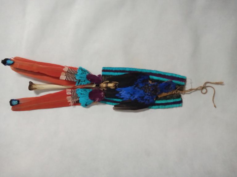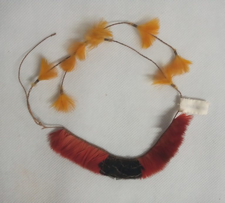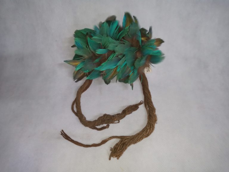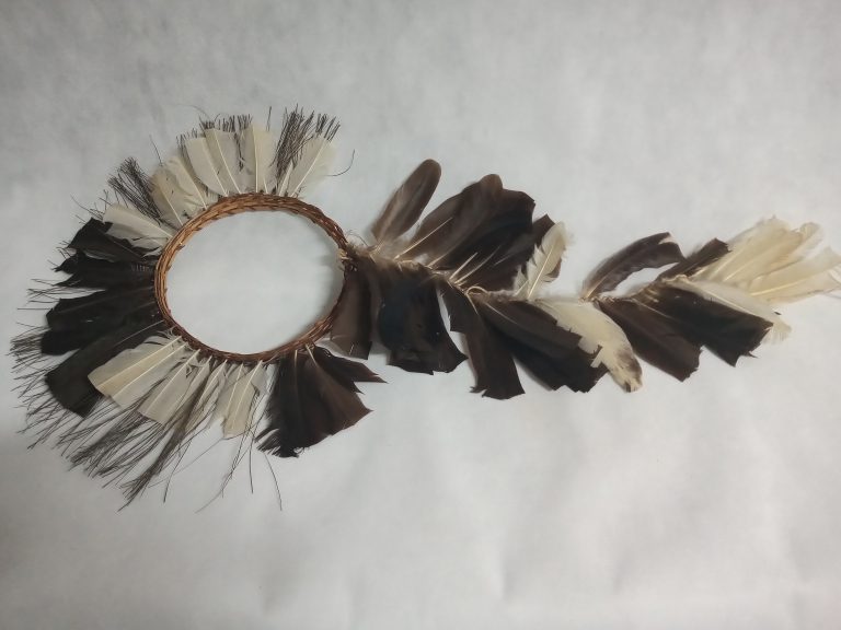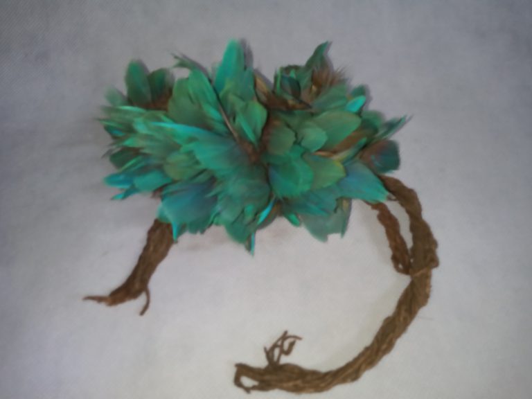 Coroa trançada com talas de arumã (trançado embricado). No entremeio das asas da coroa e fixada uma fieira de penas pardas com tom metálico verde aparadas na ponta...
