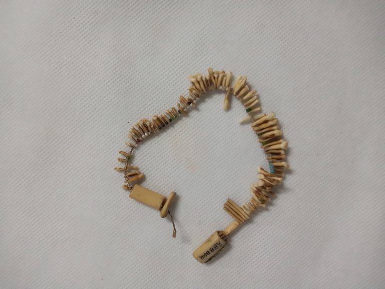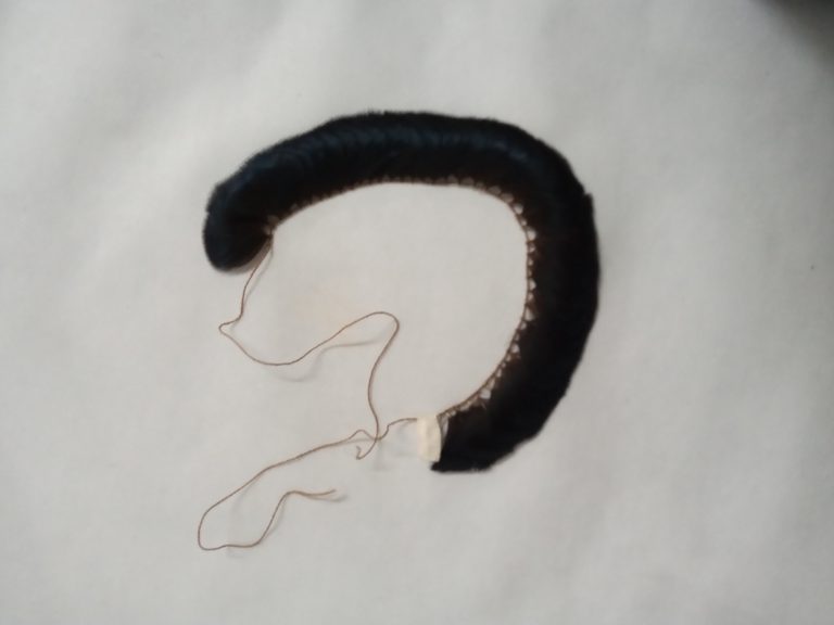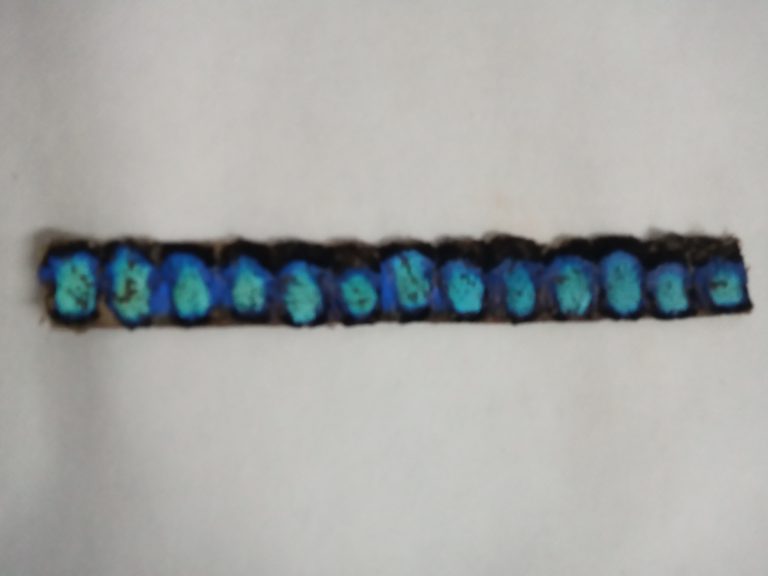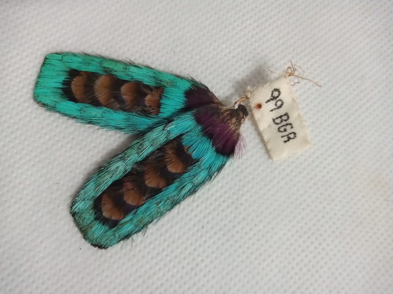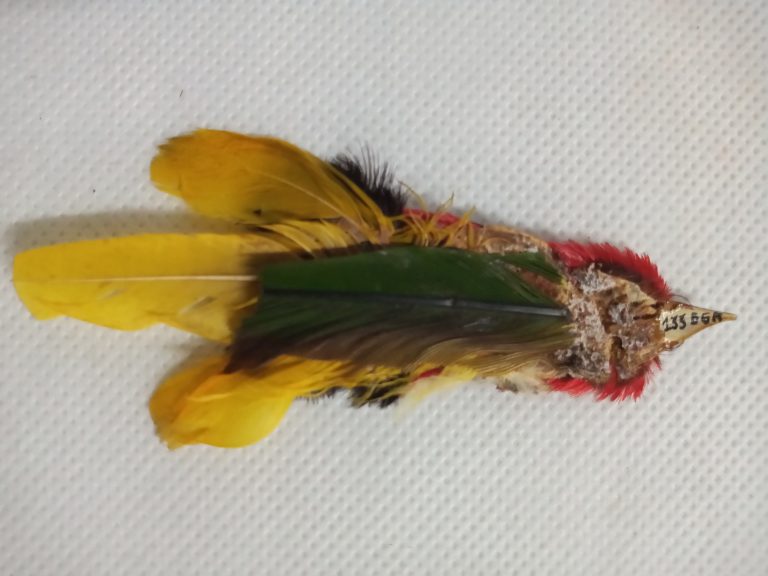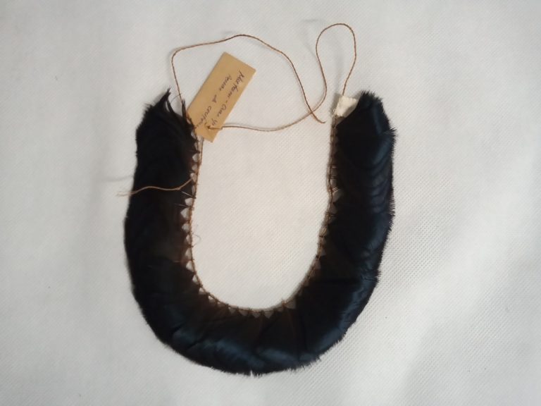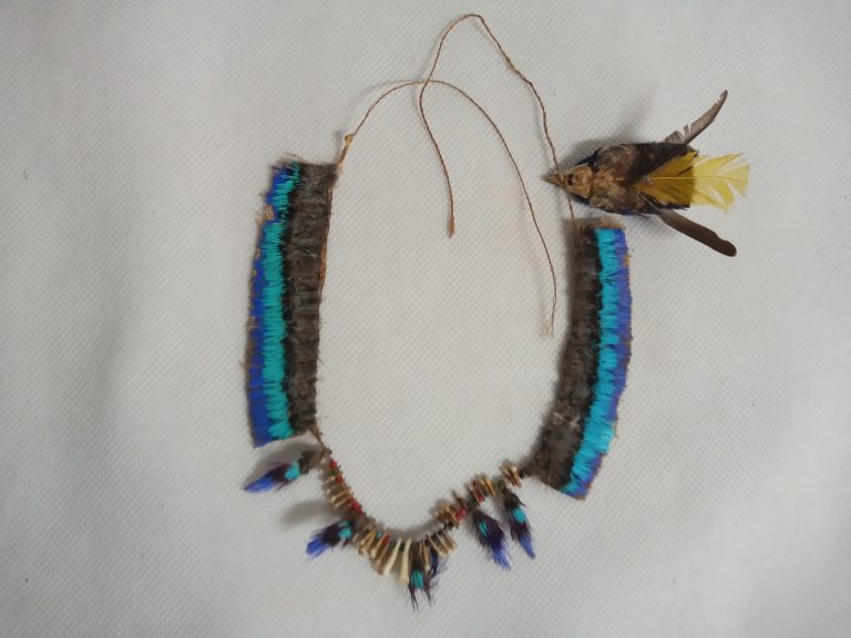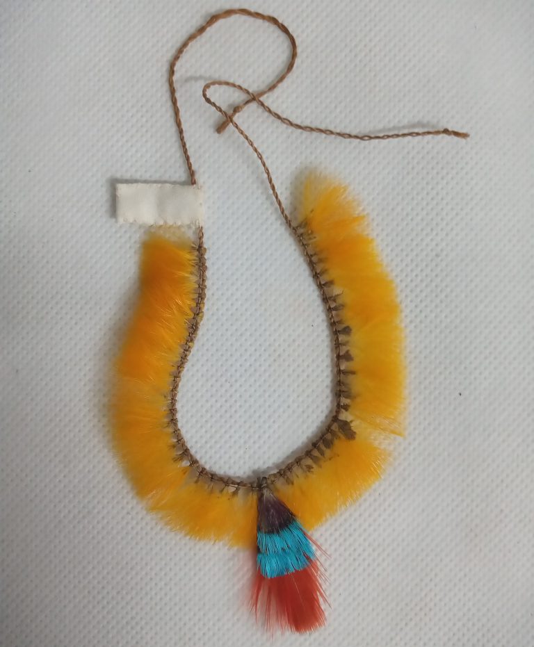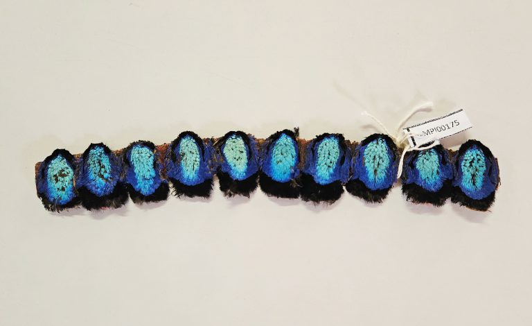 Ornato facial emplumado constituído de uma série de peles com plumas azul genciana da cabeça do sai (Cyanerges sp.) coladas sobre tira tecida de algodão com leite de...