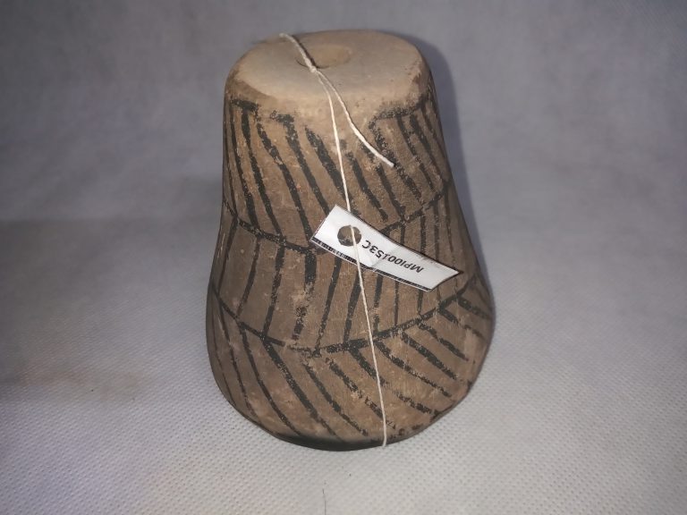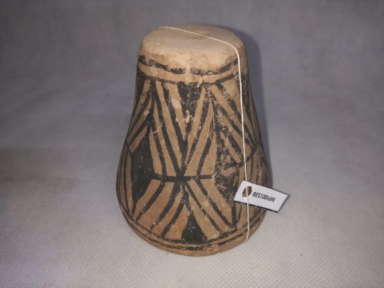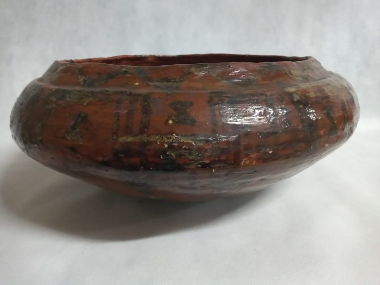 Panela de barro gameliforme de borda extrovertida, contorno carenado e base plana. A parede externa e o fundo são decorados com motivos geometrizantes em cor negra sobre fundo...