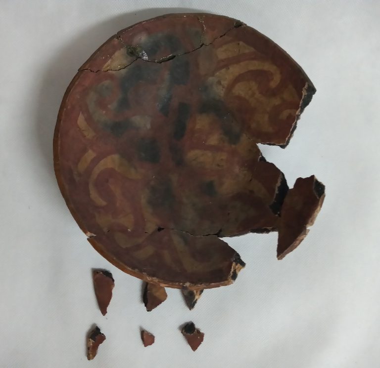 Tigela platiforme decorada interne e externamente com motivos geometrizantes semelhantes ao motivo de pintura corporal Kadiwéu. A face interna apresenta padrões em vermelho de hematita, a externa impressão...