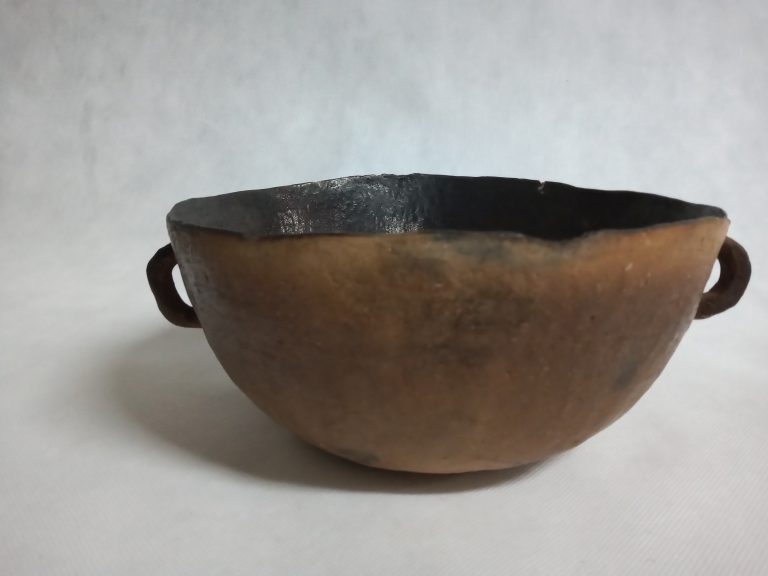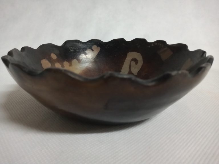 Tigela gameliforme em miniatura, lábio ondulado e base plana. Paredes interna e externa polidas e enegrecidas por esfumaramento. Decoração na face interna com pintura em negativo de motivos...