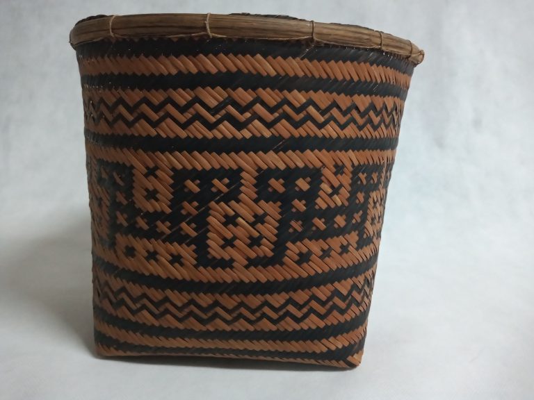 4 de junho de 2025 por Hellen Christyan Macedo de Oliveira Leia mais...Cesto vasiforme cilíndrico, trançado marchetado (negro e cor natural de arumã (Ischonsiphon sp), formando padrões característicos do grupo. Acabamento auto remate com aro plano, tipo Uaupés. Confeccionado para...