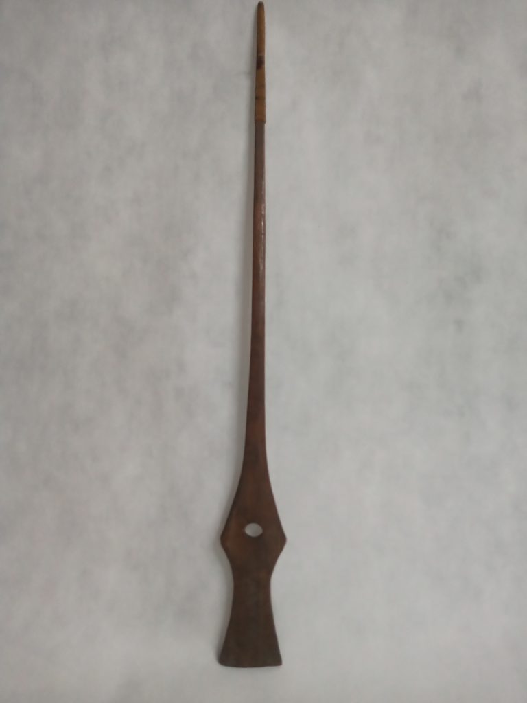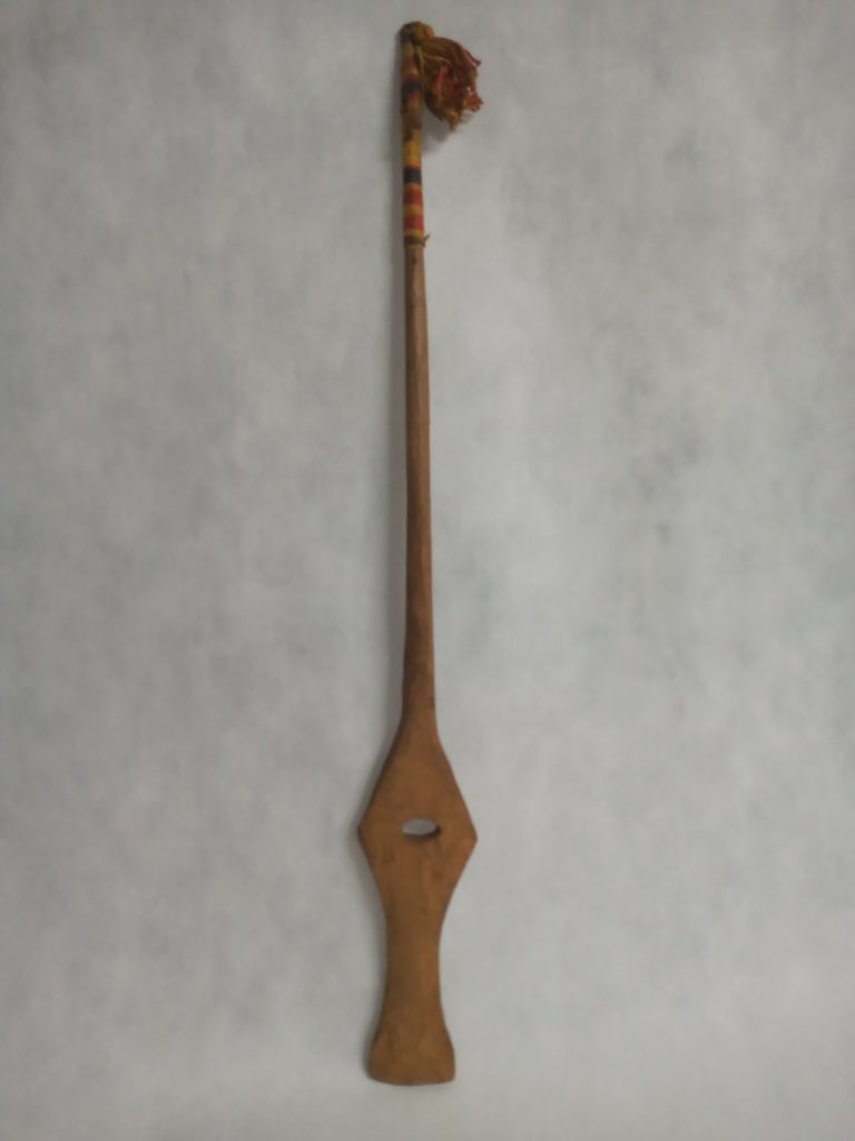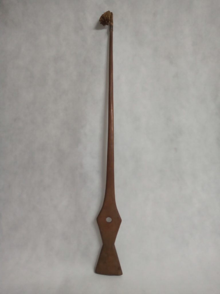 4 de junho de 2025 por Hellen Christyan Macedo de Oliveira Leia mais...Tabuleta de madeira talhada em forma de ampulheta, com um furo na parte mediana. Prolonga-se em vara e termina com um gancho, neste caso de madeira.