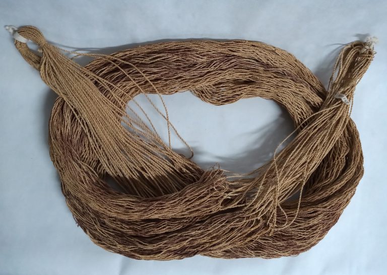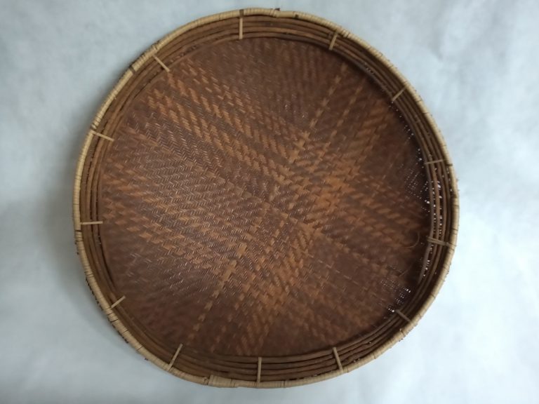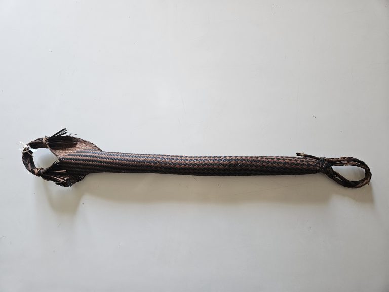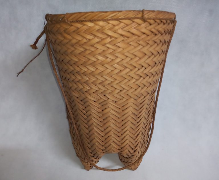 Cesto vasiforme com tampa, feitio de vaso cilíndrico confeccionado com arumã sem descascar (marrom queimado), trançado sarjado, padrão “espinha de peixe”. Acabamento na borda com auto remate com...