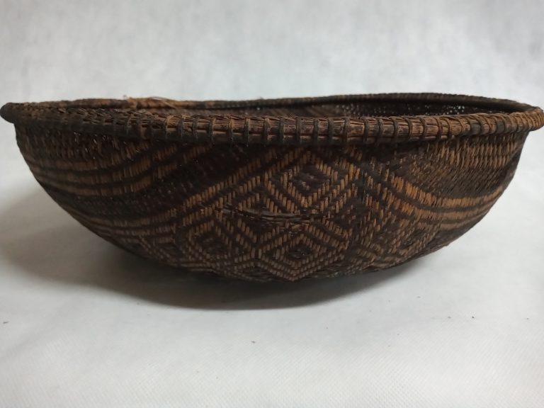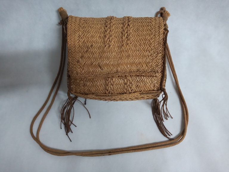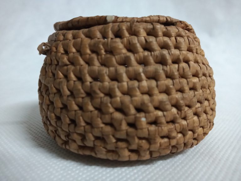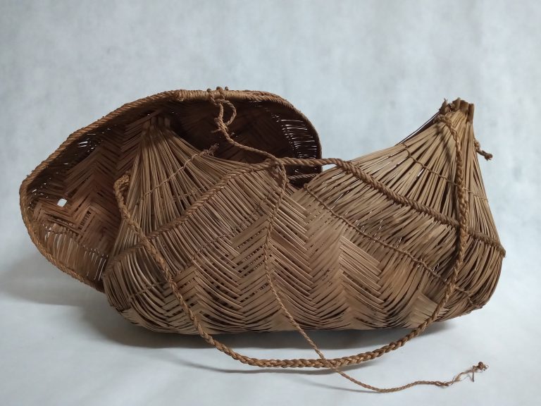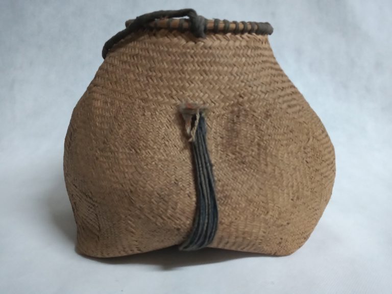 Cesto bornaliforme bojudo, com tampa e alça para suspender. Confeccionado com palha de prefoliação de palmeira buriti (Mauritia vinifera), trançado sarjado. Utilizado para transporte, armazenagem e como berço....