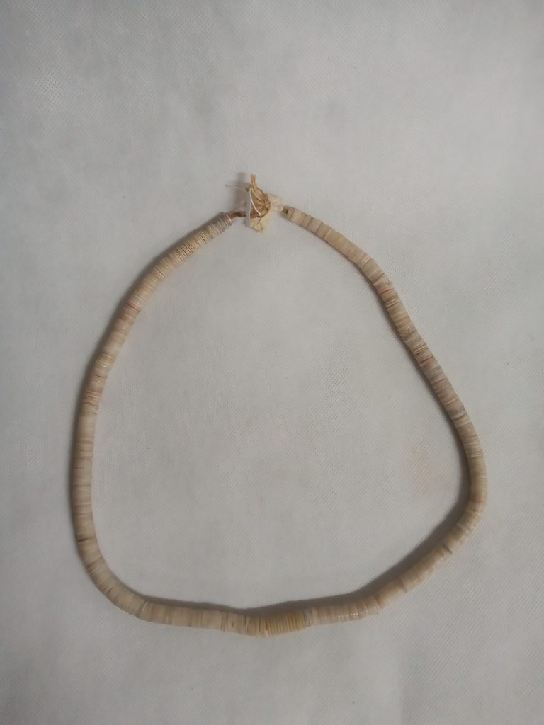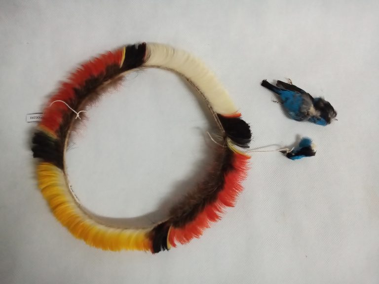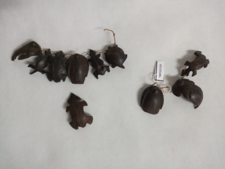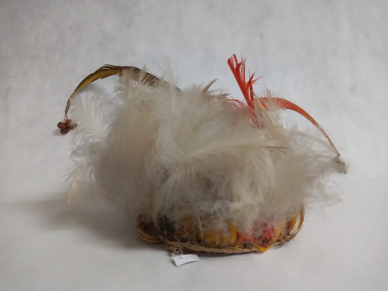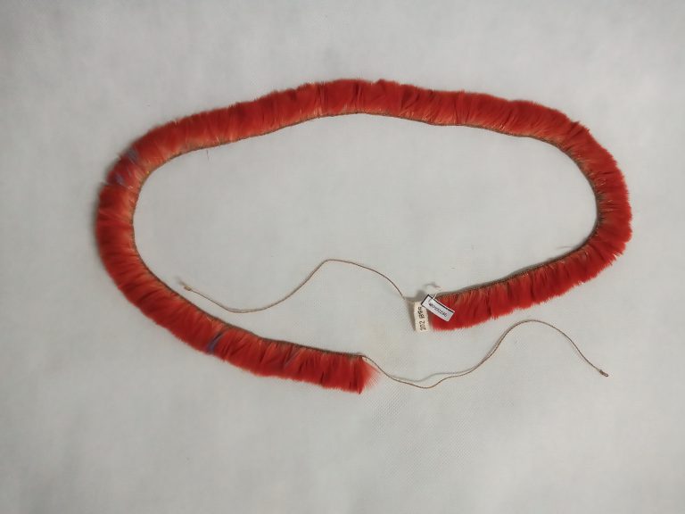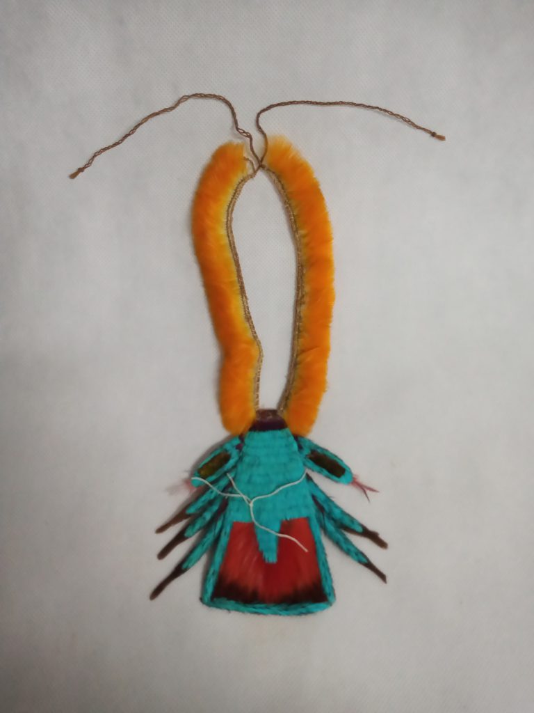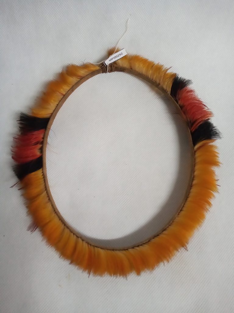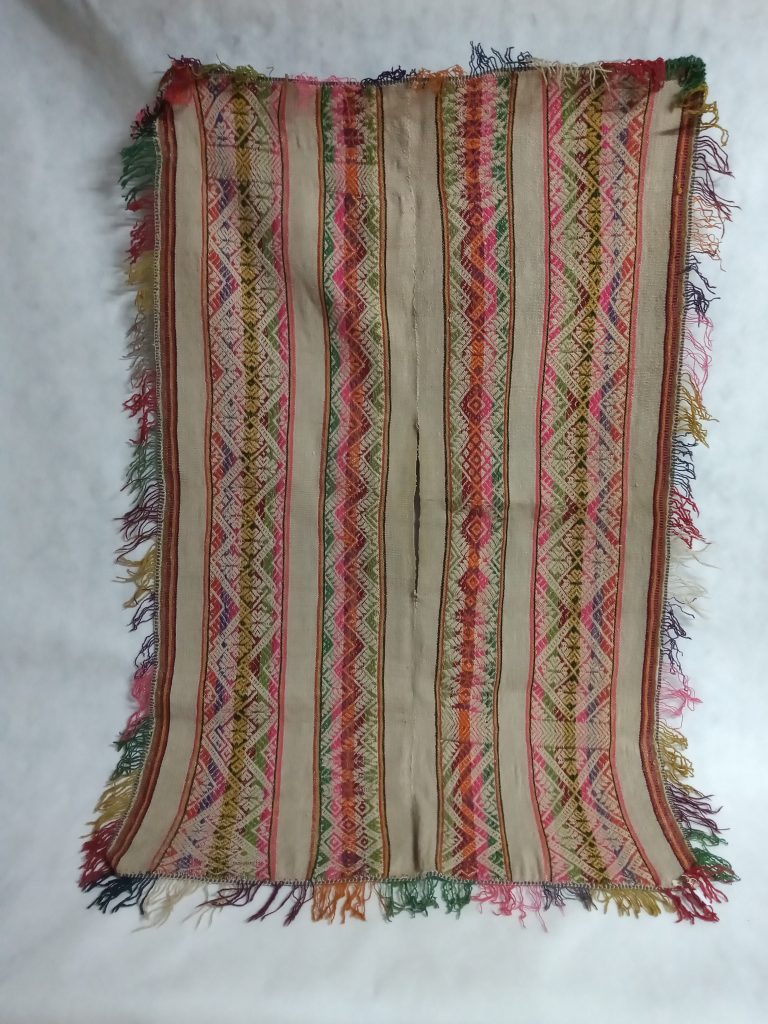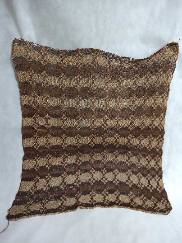 Tecido segundo a técnica de enlace malha-ampulheta (malhas acopladas lateral e verticalmente). Uso de fios da cor natural da linha, marrom e pardo formando desenhos ortogonais contrastando fundo...