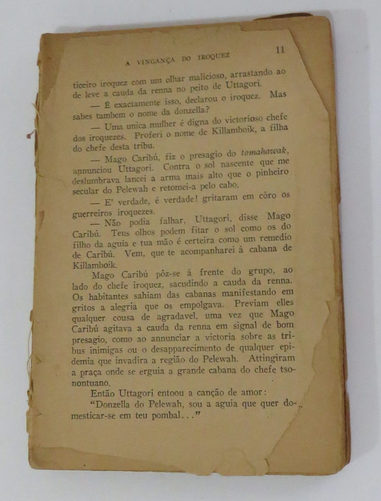 Livro “A vingança do Iroquez”, de Emilio Salgari, editora Companhia Editora Nacional, com 188 páginas. Sem capa. Numeração “98A-6-010-01.01” marcada na parte interna da contra capa.