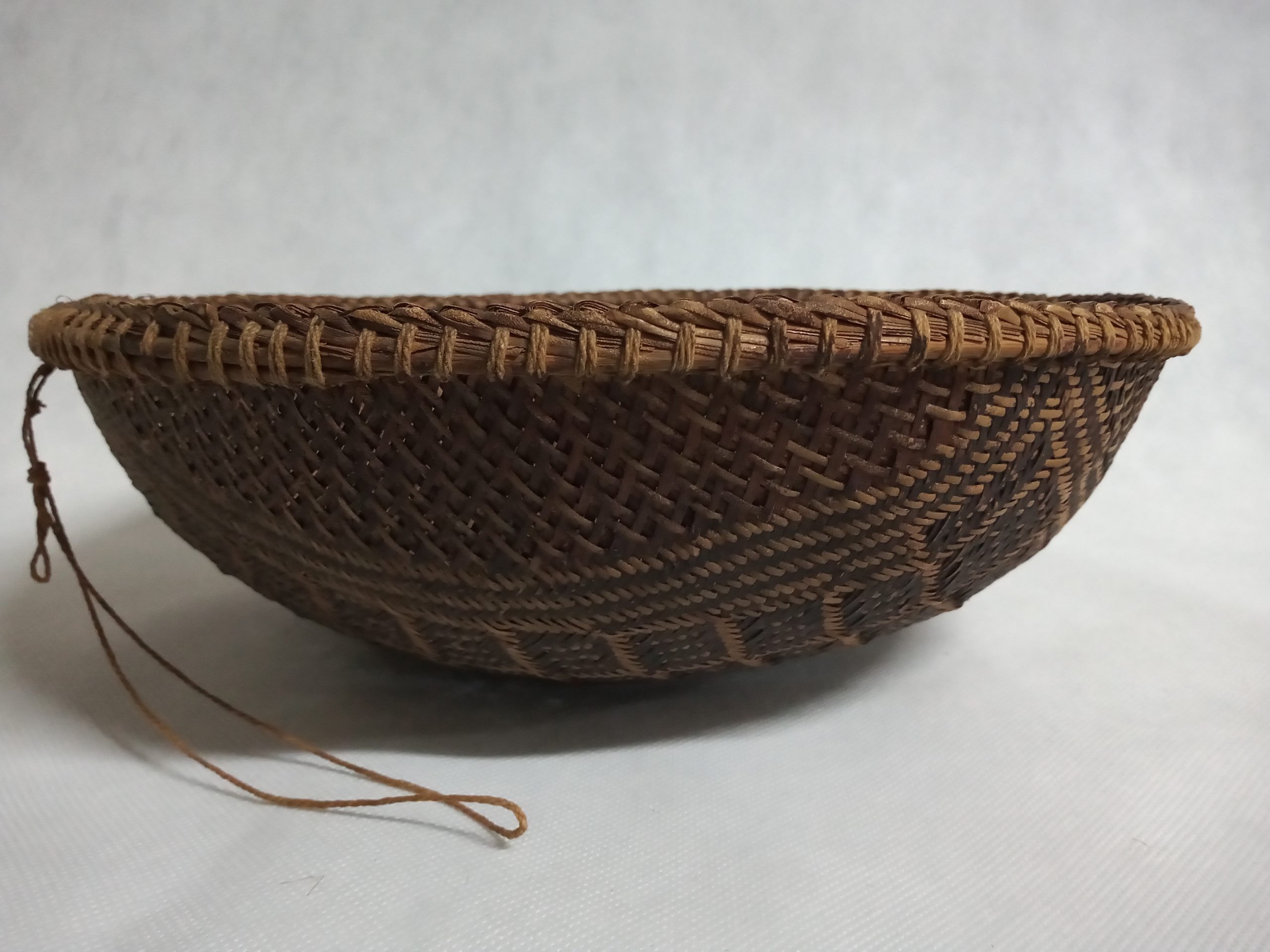 Cesto tigeliforme confeccionado com finas talas de taquarinha (Arundinaria sp) nas cores natural e marrom tingida com seiva de entrecasca de jequitibá (Carinianaestrellensis). A tintura é passada em toda a extensão de cesto (parte interna e externa) e raspada das talas lisas. O trançado exibe o motivo awatsi’ai: sementes de milho – losangos com diamantes. Acabamento tipo Tapirapé. Excedente de fio de tucum gera uma alça.