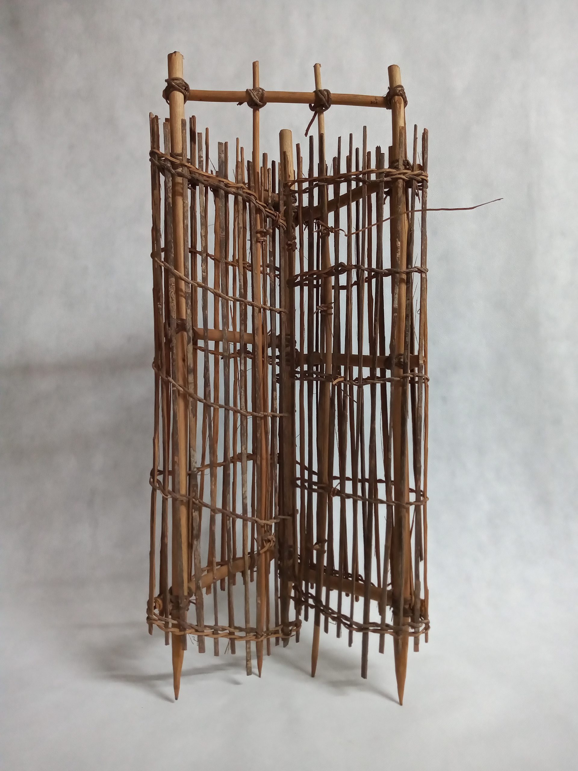 Miniatura de armadilha de pesca permanente em forma de grande cesto triangular com abertura vertical no centro. É fincada no leito do rio junto à correnteza que impele o peixe para dentro da armadilha. As paredes alcançam até 4 m de altura e o peixe é retirado pela abertura superior com rede de pesca. Serve também como curral de peixes e tartarugas.