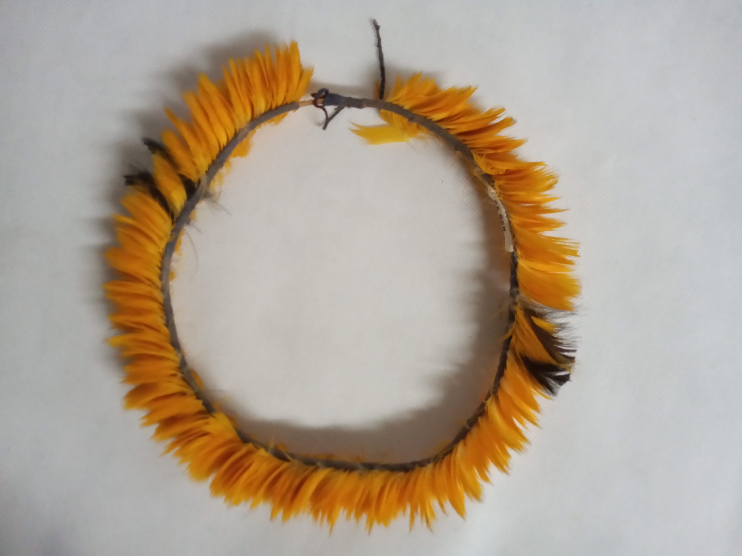 Aro confeccionado com uma lasca de taquara revestida com plumas amarelas peitorais de arara canindé (Ara ararauna) dispostas com o lado avesso para fora numa só direção. Pluminhas negras de mutum matizam o amarelo em duas extremidades do aro.