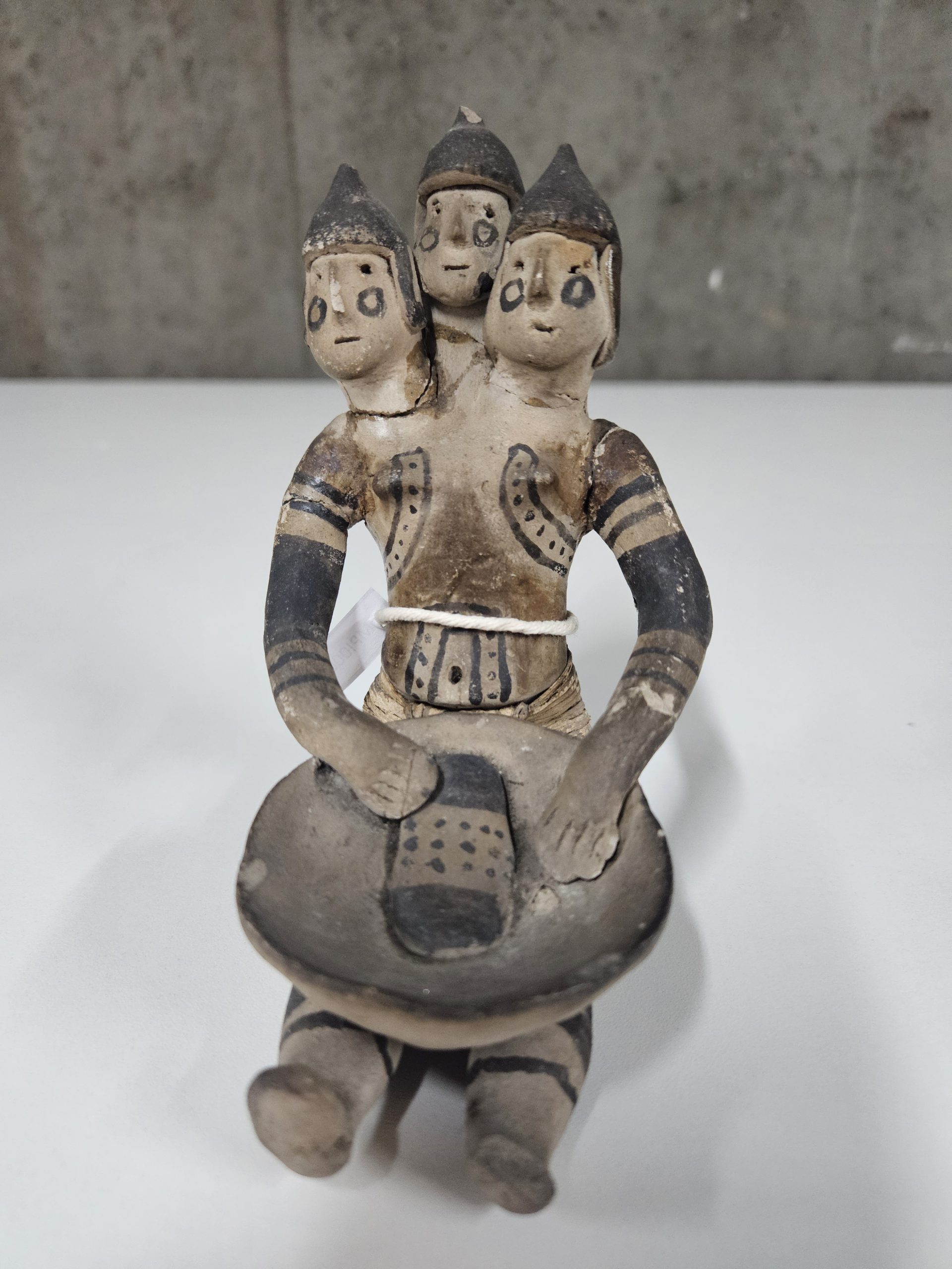 Estatueta temático-figurativa modelada em barro representando figura humana tricéfala, sentada com um prato de cerâmica no colo. Caracterizada etnicamente pelo corte de cabelo, pintura corporal, tanga de entrecasca e seios, indicando tratar-se de mulher.