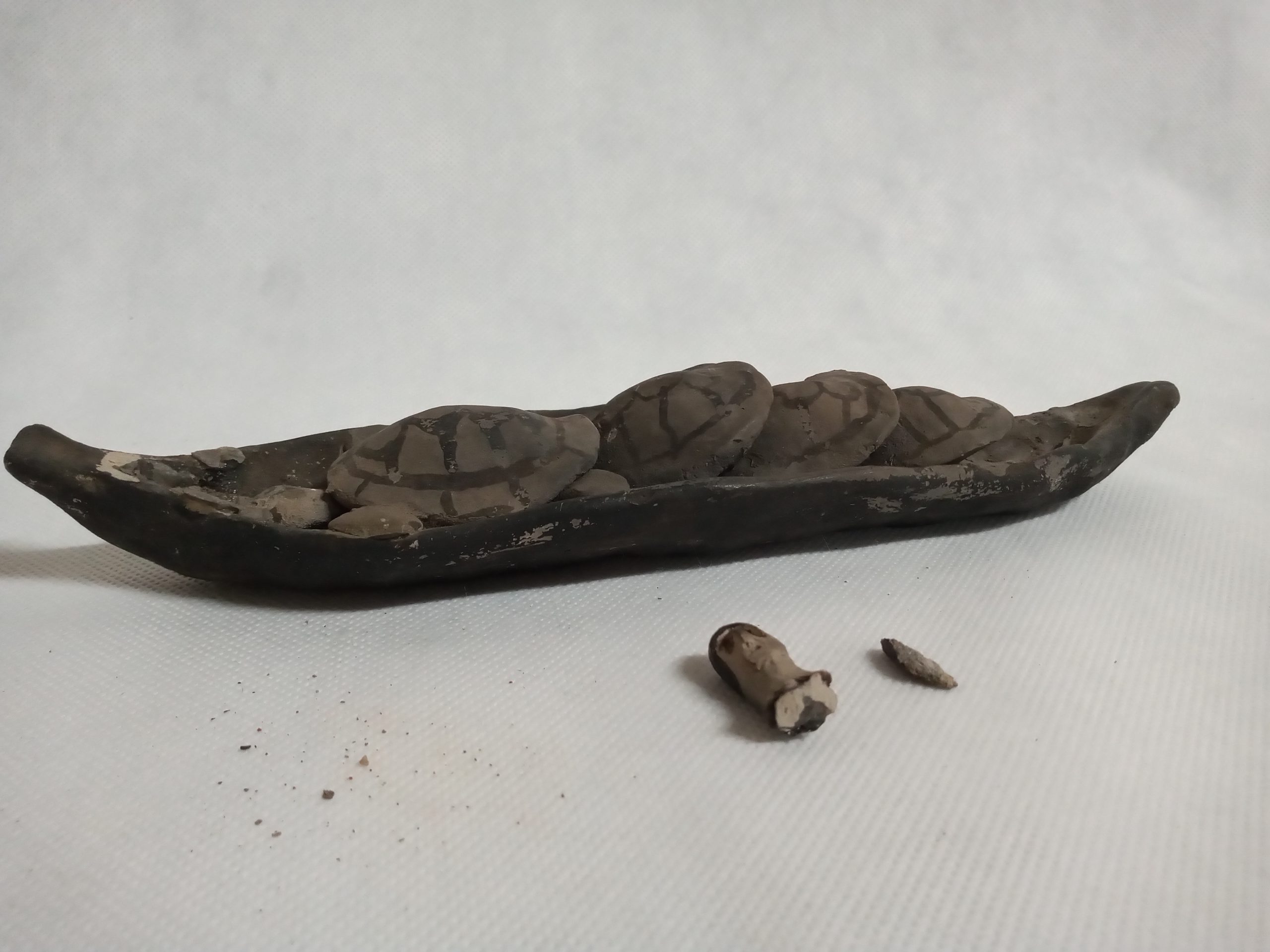 Estatueta temático-figurativa modelada em barro representando canoa em cujo interior se amontoam quatro tracajás (Podocnemis cayennensis). Na proa, uma figura humana masculina etnicamente caracterizada pela pintura corporal Karajá. QUEBRADO.
