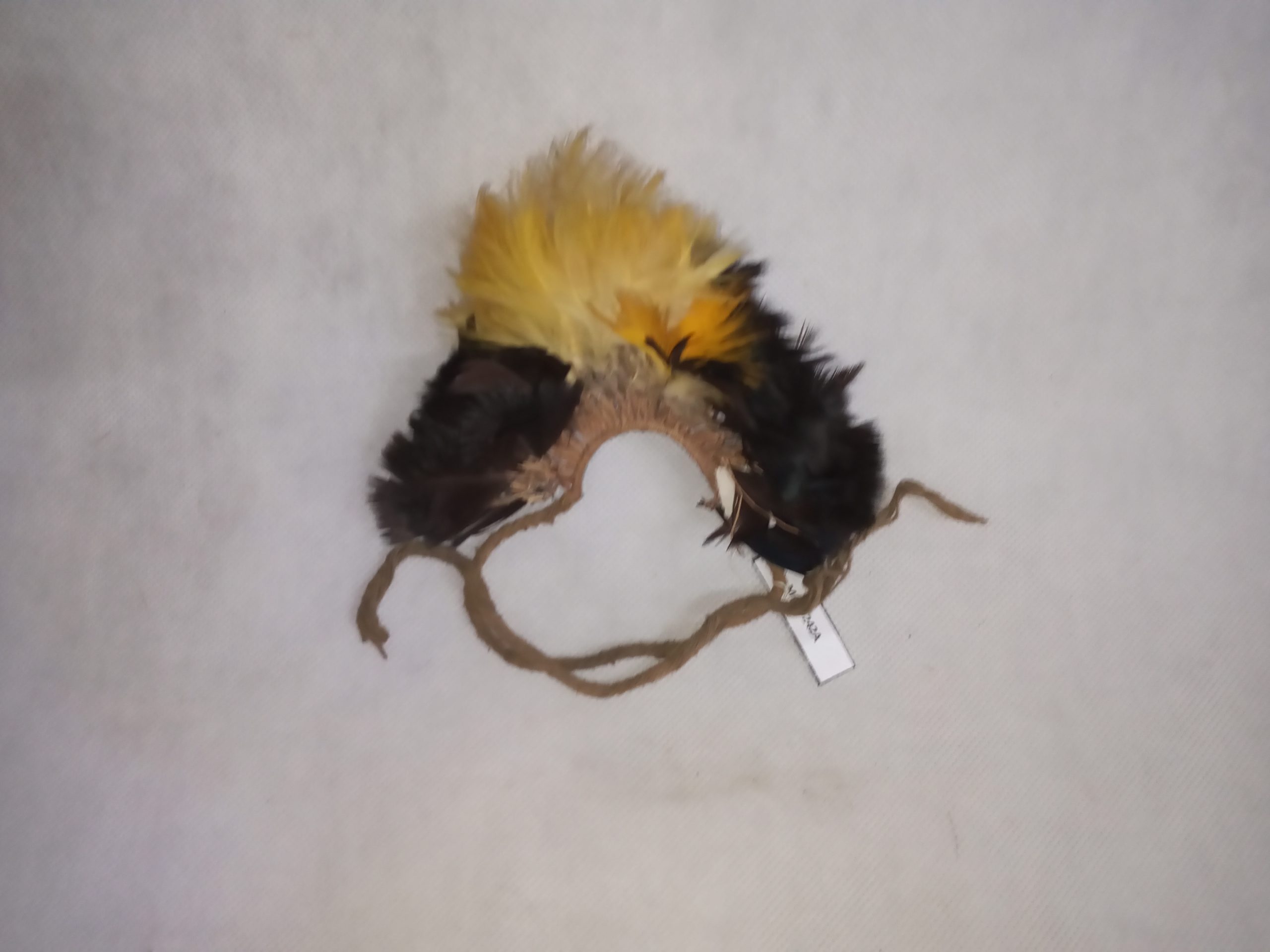 Braçadeiras infantil confeccionado com um tecido de fio de buriti (Mauritia flexuosa) de cujas alças pendem plumas negras de mutum (Crax sp), plumas peitorais amarelas de tucano (Ramphastus sp). Arremate nas extremidades para prender a peça ao antebraço com fios torcidos de algodão. Relação com o objeto MPI00242.