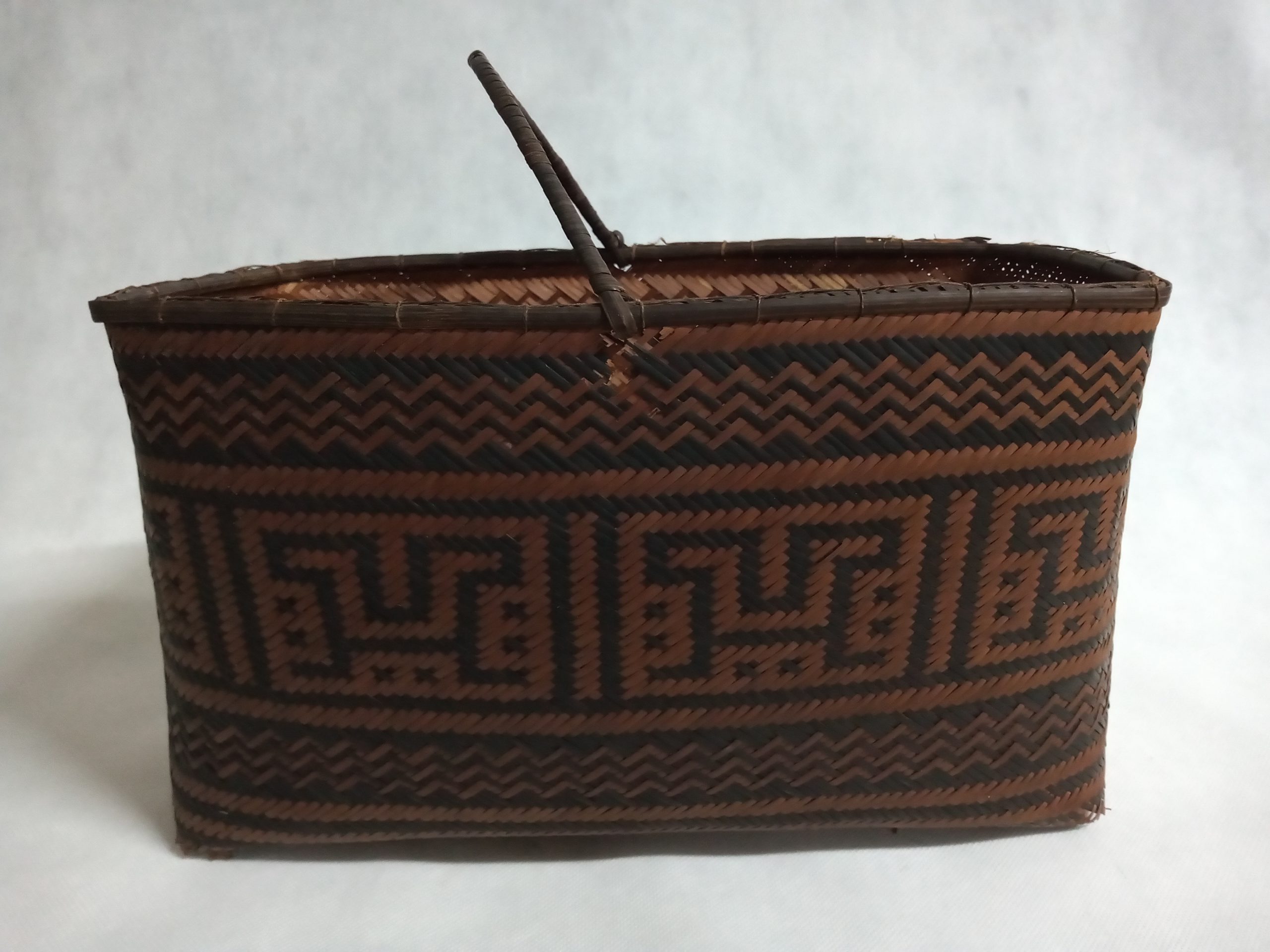 Cesto bolsiforme retangular feito para a venda (imitação de modelos ocidentais) com alça e borda simples (acabamento tipo Uaupés). Confeccionado com talas de arumã, trançado marchetado, padrão decorativo “lagarta mítica” característico do grupo.