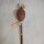 perpassa o corpo fechando as perfurações e prendendo pequenos corpos (sementes, pedras) dentro da cabaça que, agitada, produz som. Haste passante forma empunhadura e pontal com acabamento de penas presas por amarração de fio de fibra vegetal. Empunhadura com acabamento em fios de fibra junto à cabaça. Perfurando a empunhadura, fio sustenta sementes e ossos intercalados, um conjunto de cada lado. Ponta de flecha lanceolada presa por amarração à base da empunhadura. Cabaça decorada por entalhe reproduzindo representação de rosto humano."