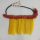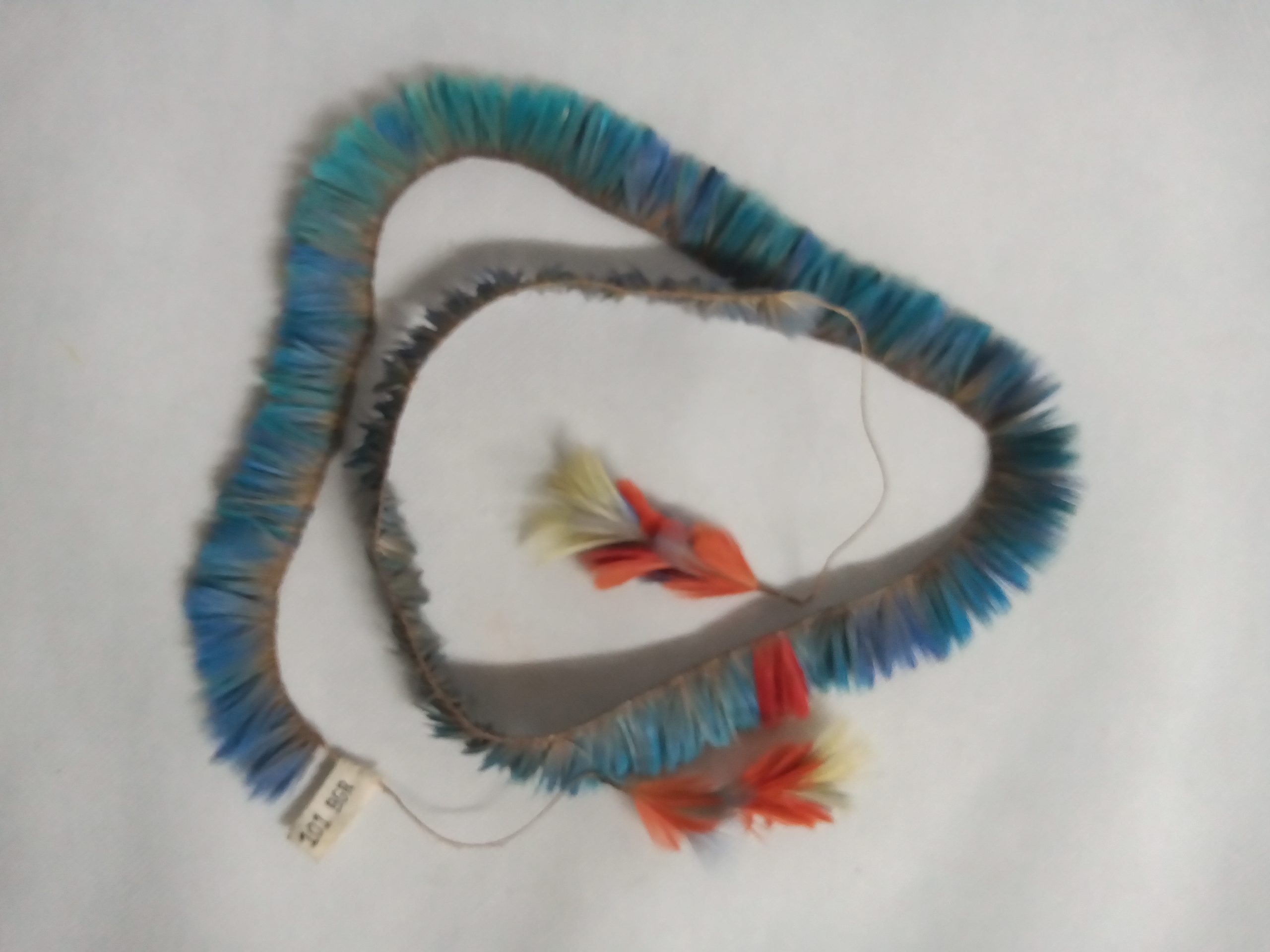 Cinto constituído de uma fieira de plumas uropigiais de duas espécies de araras (A. macao e A.chloroptera) com um entremeio de plumas vermelho-rasil do pescoço da arara verde. Arremate de rosetas de plumas das mesmas aves, bem como amarelas de tucano.