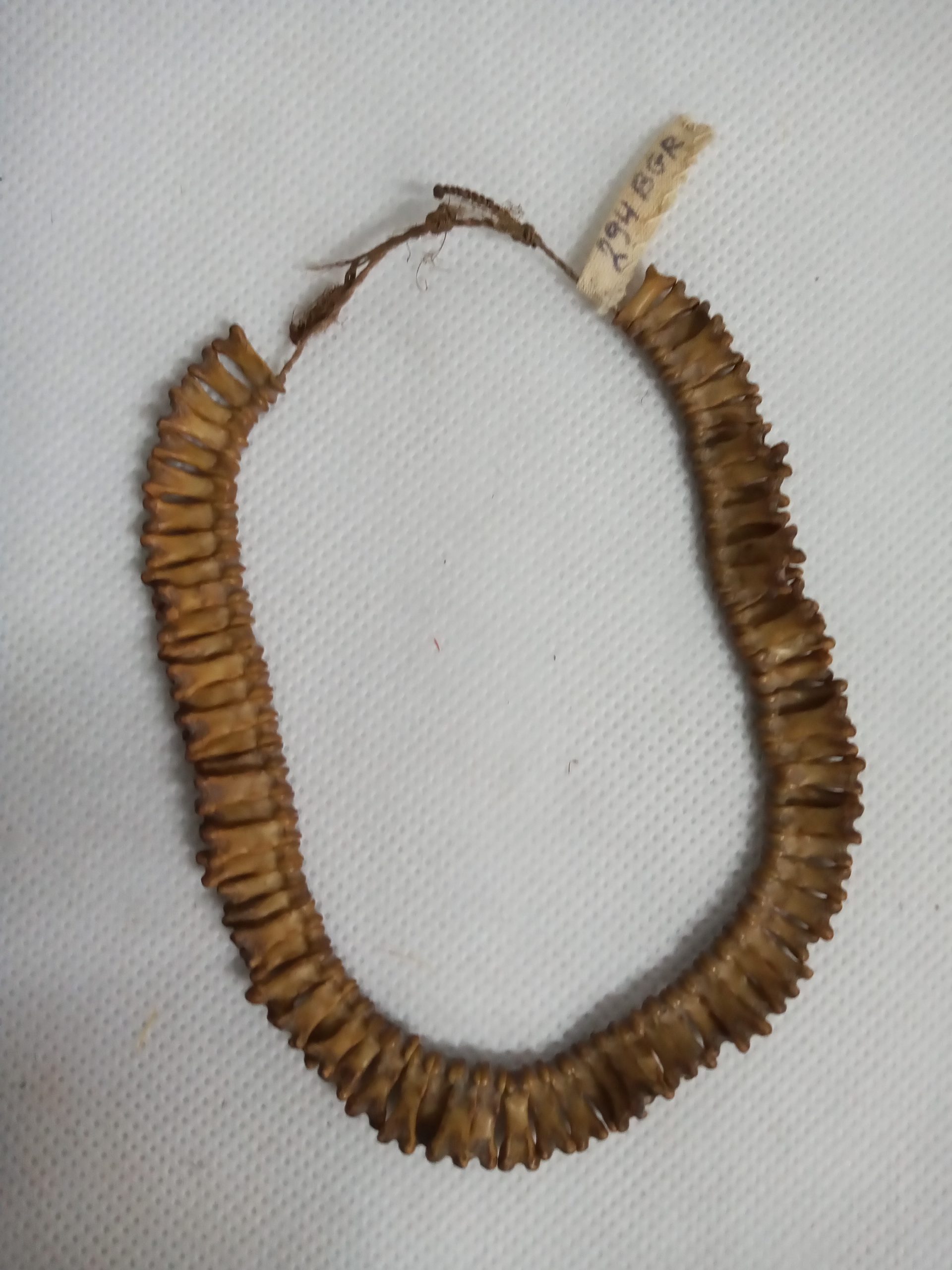 Coleção Memorial dos Povos Indígenas Item Colar costelas Documento MPI00226 Baixar Metadados ColeçãoColeção Berta RibeiroDenominação/LinguagemColarTítuloColar costelasAutoriaAutoria DesconhecidaEtniaUrubu-KaaporClassificaçãoEquipamento de uso pessoal > Produto de origem vegetal/animal > Adorno corporal, colar, dentesDescriçãoColar infantil enfiado em cordel de fibra vegetal torcida de ossinhos parecendo costelas de animal de pequenas proporções.Dimensão (cm)24 cm (P)Peso (gramas)90Material/técnicaadorno corporal | dentes de mamífero | fio vegetalLocal de produçãoRio Gurupi, Maranhão, BrasilData de produçãoDesconhecidaCondições de reproduçãoNão há informação Continue navegando Braçadeira emplumada Colar dentes de mamífero Voltar para a página de itens