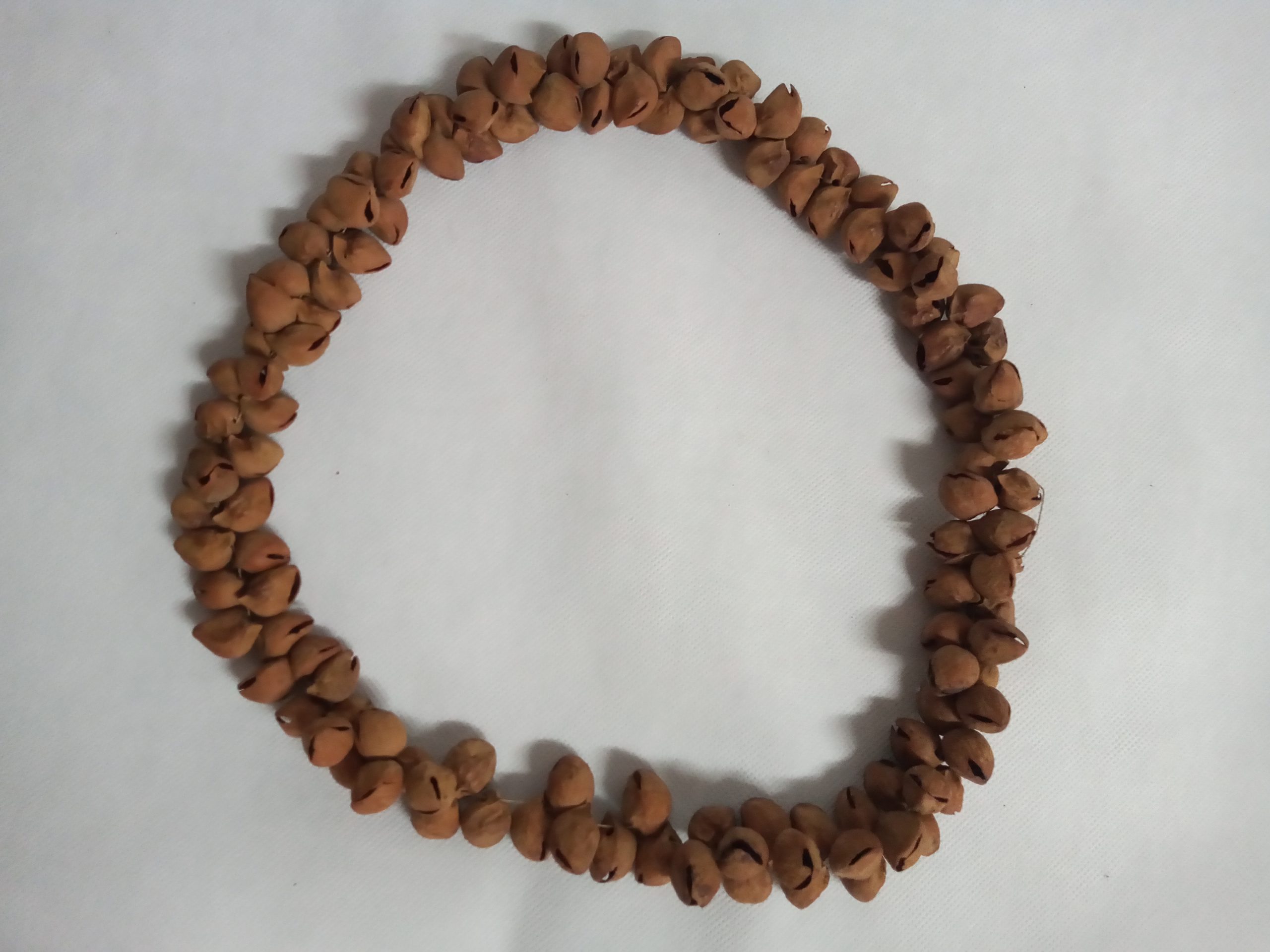 Colar constituído de uma enfiadura em cordel de fibra de palmeira de cápsulas (ou sementes) de fruto marrom claro com uma abertura em “v” na ponta solta de uma abertura (natural ?) na extremidade arredondada oposta por onde passa o fio de suspensão.