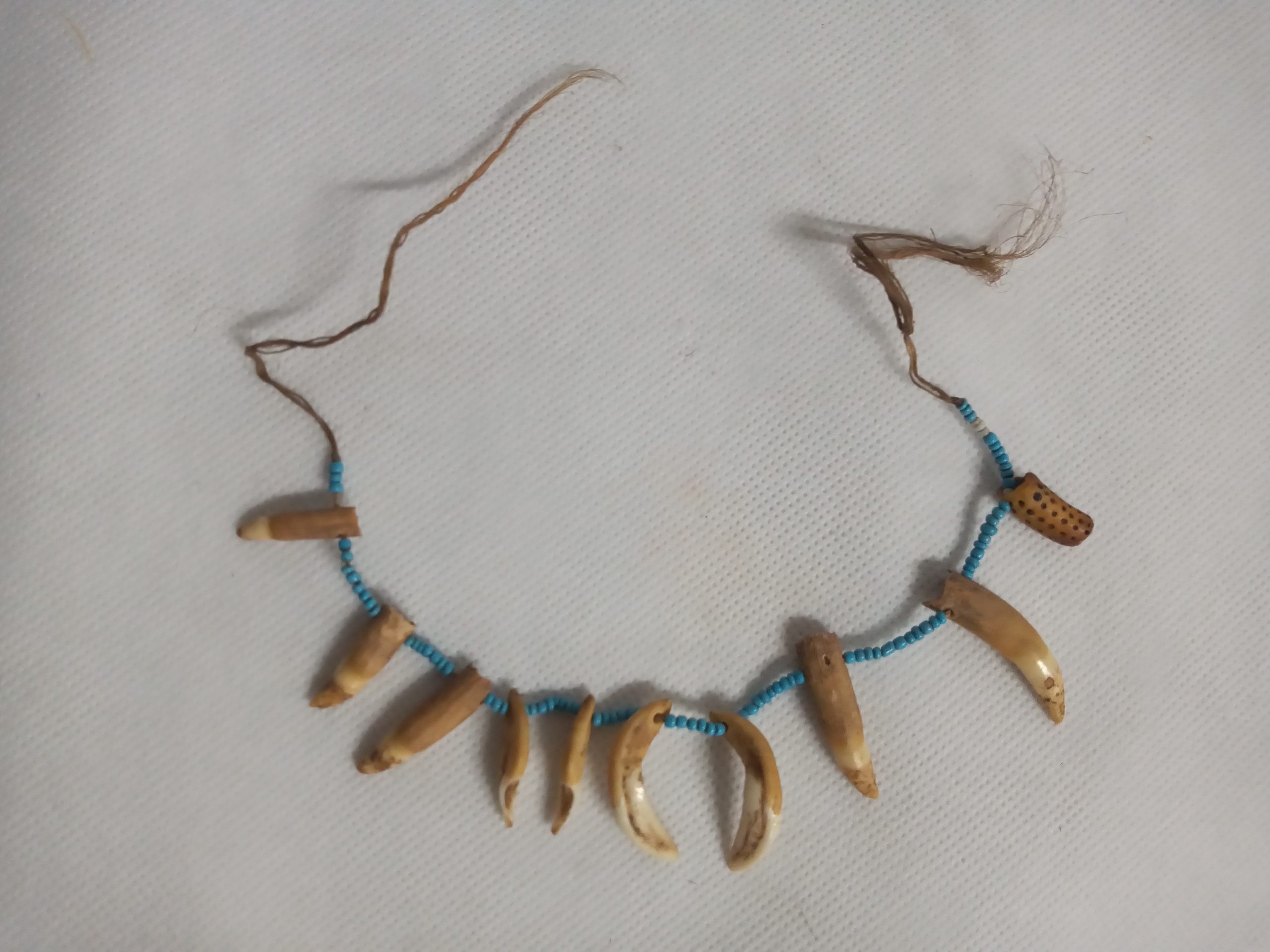 Coleção Memorial dos Povos Indígenas Item Colar dentes de mamífero Documento MPI00199 Baixar Metadados ColeçãoColeção Berta RibeiroDenominação/LinguagemColarTítuloColar dentes de mamíferoAutoriaAutoria DesconhecidaEtniaUrubu-KaaporClassificaçãoEquipamento de uso pessoal > Produto de origem vegetal/animal > Adorno corporal, colar, dentesDescriçãoColar infantil composto de enfiadura de 9 dentes de mamífero, intercaladas por miçangas azuis e um canutilho de osso gravado com pontos pretos.Dimensão (cm)40 cm (P)Peso (gramas)180Material/técnicaadorno corporal | cordel de fibra | dentes de raiz longa | fragmento de osso | miçangasLocal de produçãoRio Gurupi, Maranhão, BrasilData de produçãoDesconhecidaCondições de reproduçãoNão há informação Continue navegando Colar-apito Peitoral dentes de roedor Voltar para a página de itens