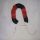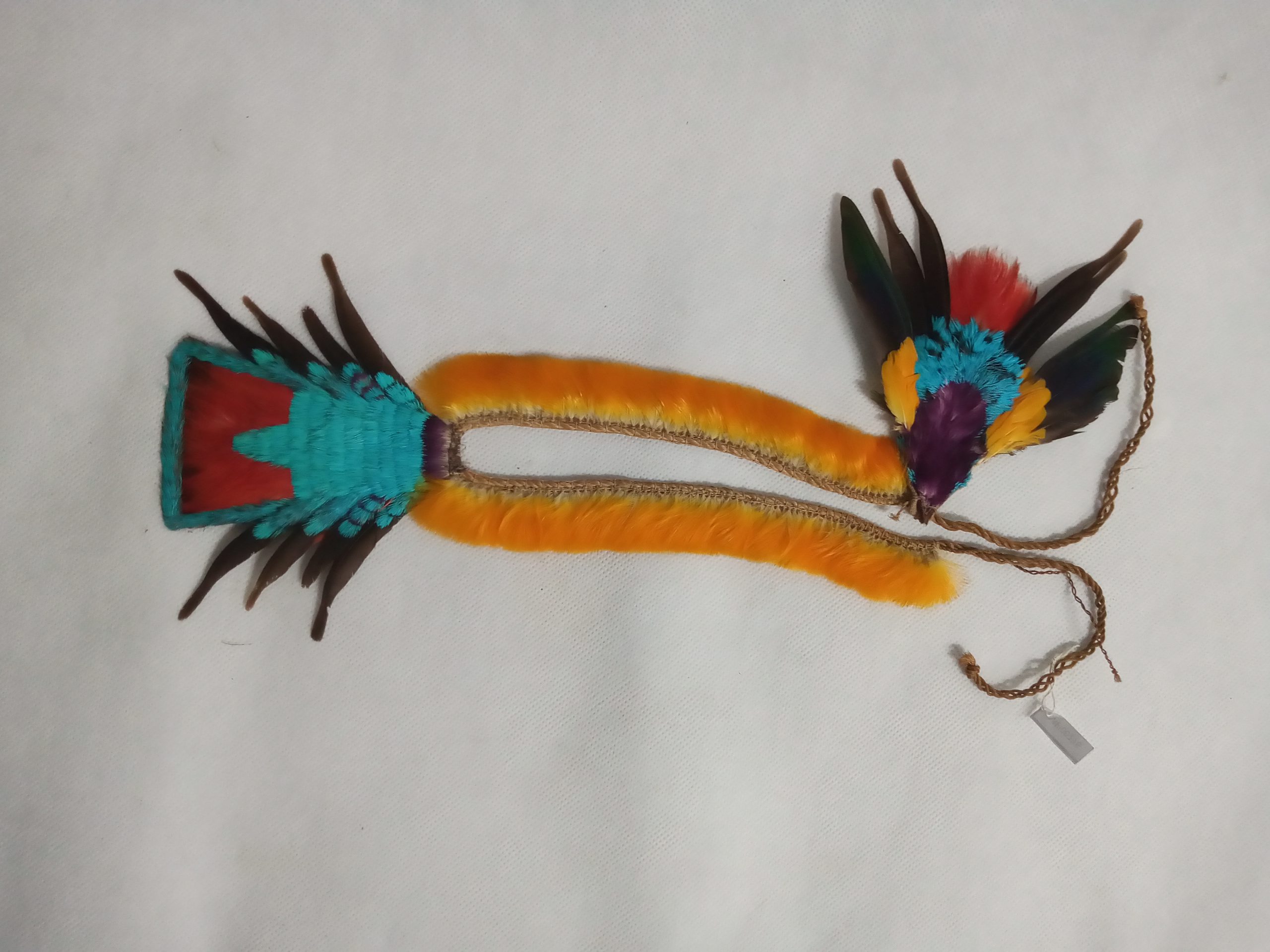 Colar emplumado de uso feminino. Compõe-se de um cordel-base que sustenta ao centro um medalhão e lateralmente duas fieiras de plumas alaranjadas do papo do tucano (Rhamphastus vitellinus). O medalhão, que imita a forma da ave, e integrado por plumas azuis de anambé azul (Cotinga cayana) que emolduram as penas caudais vermelho-marroquino de saura (Phoenicercus carnifex). A guisa de asas comparecem penas remiges negras parcialmente revestidas de plumas azuis de anambé azul.