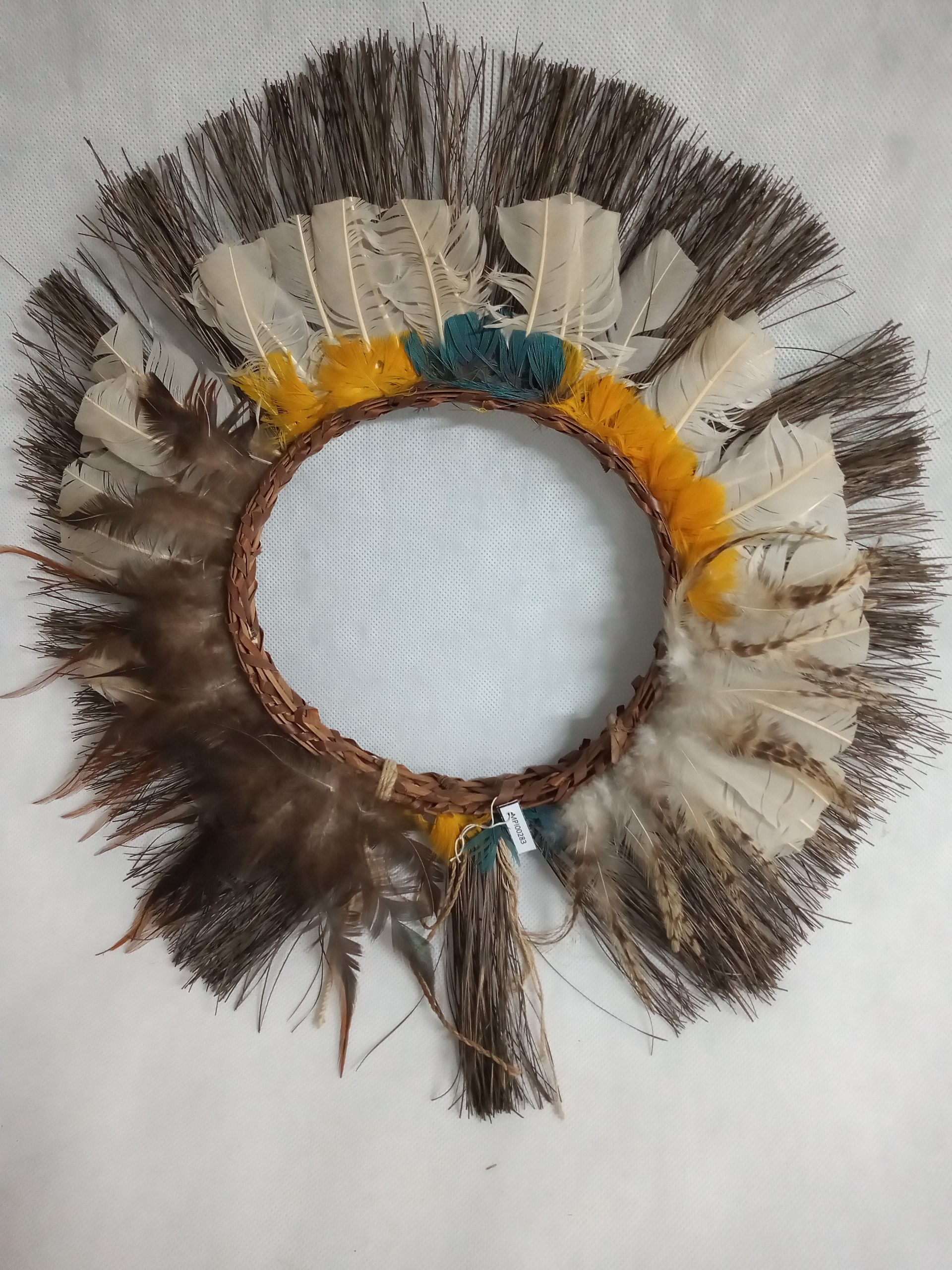 Coroa horizontal emplumada constituída de um suporte trançado (técnica: embricado) de talas de arumã (Ischnosiphon sp). Entre as duas asas do trançado são inseridas duas fieiras de plumas; a maior formada com plumas brancas de gavião (Harpia sp) e rajadas de pássaro não identificado; a menor, que esconde os raques dos canhões da anterior, de penas amarelas e azuis de arara canindé (Ara ararauna). Uma terceira fieira inserida na calha trançada e constituída de cerdas aparadas na ponta de porco-do-mato (caititu – Tayassu tayassu).