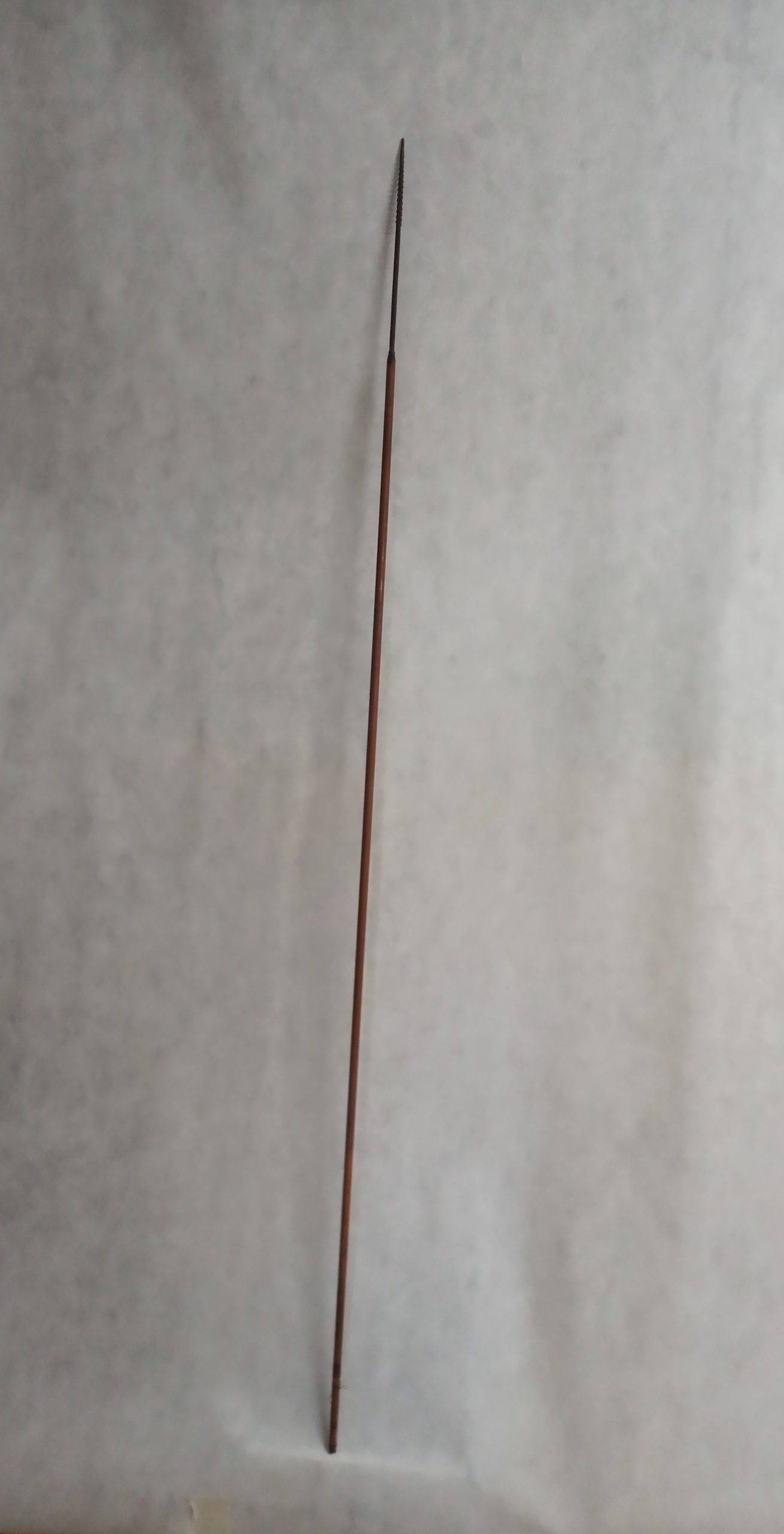 Projétil perfurocortante com ponta bi serrilhada para ser propelida com uso de arco. Corpo cilíndrico em canabrava. Engaste em fenda. Aletas em penas fixas com fio não identificado em tom lilás, fibra vegetal arrematada com cerol. Arremate de fibra e cerol para fixar a ponta à haste. Serve para animais pequenos, como ratos e lagartixas.