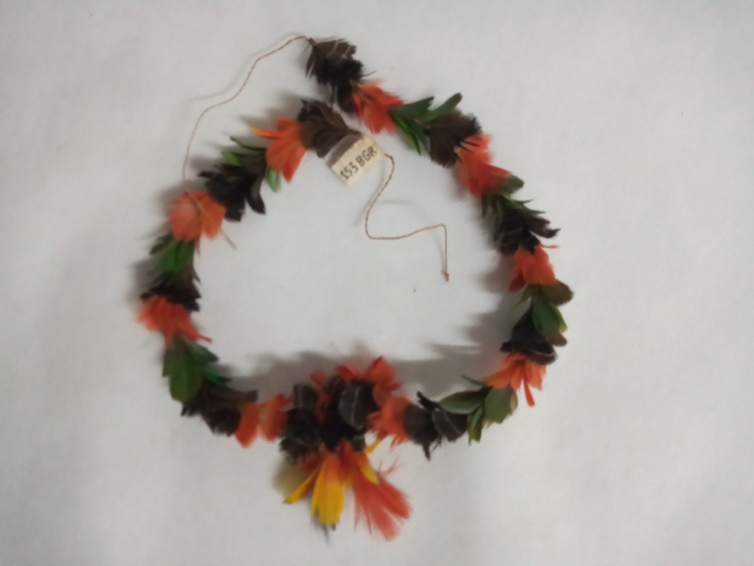 Grinalda confeccionada para a venda com rosetas de penas negras matizadas de branco de mutum fêmea (Crax pinima) e vermelhas peitorais de arara canga (Ara macao), verde de papagaio (Amazona aestiva) presas com fio de caroá a uma tala de arumã. A emplumação em roseta recobre todo o suporte.