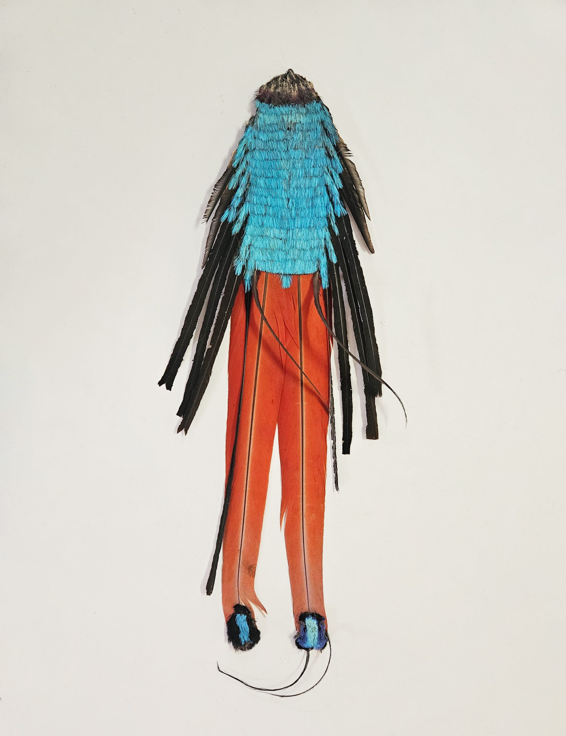 Ornato labial de material plúmeo constituído de uma base (penas vermelhas caudais de arara canga) revestidas numa das faces por camadas de plumas azuis de anambé azul (Cotinga cayana) ladeadas por penas negras de cotingideo dispostas diagonalmente a maneira de asas. Na parte superior comparece a pele da cabeça de sai (Cyanerpes cyaneus).