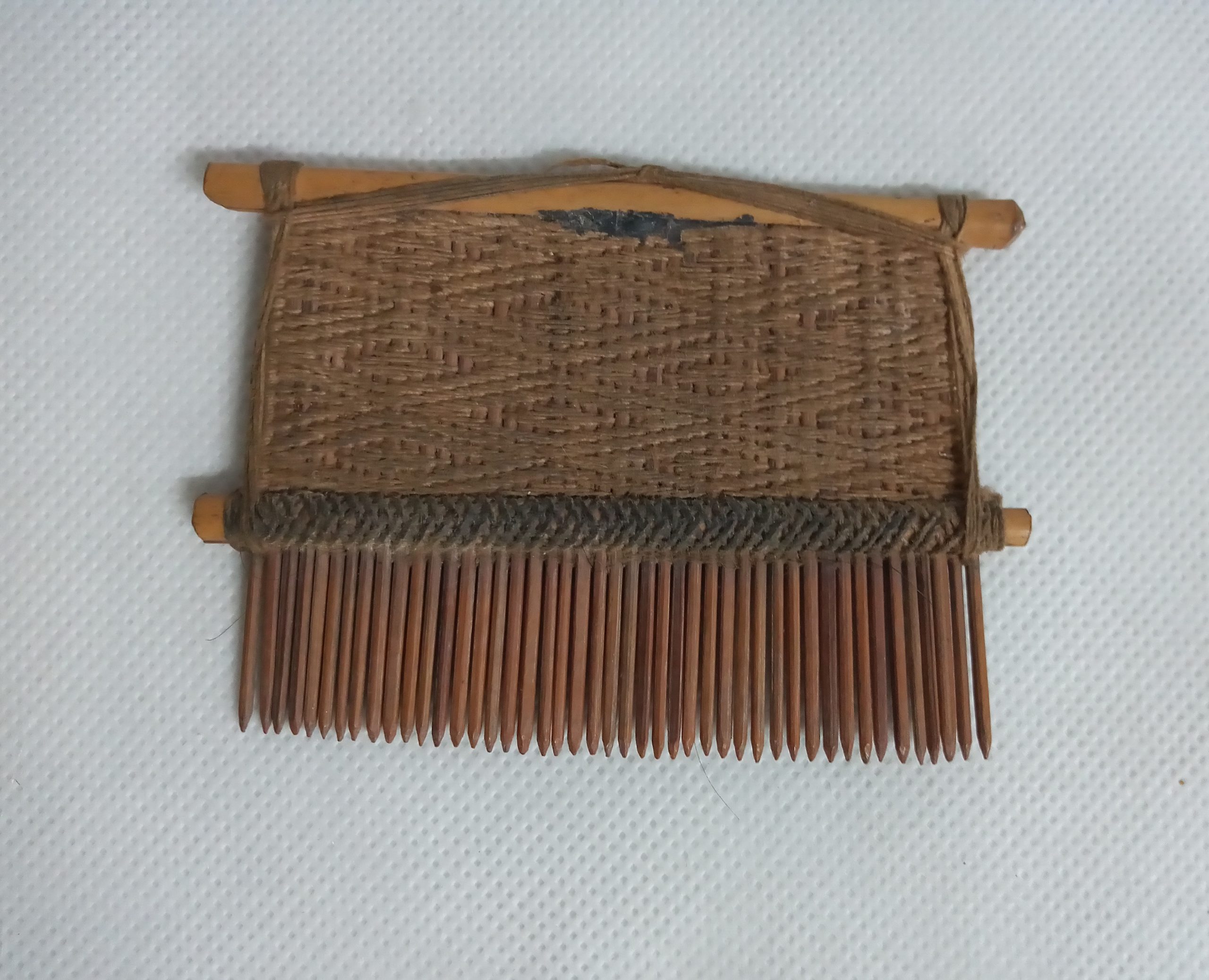 Coleção Memorial dos Povos Indígenas Item Pente singelo de duas hastes Documento MPI00159 Baixar Metadados ColeçãoColeção Berta RibeiroDenominação/LinguagemPenteTítuloPente singelo de duas hastesAutoriaAutoria DesconhecidaEtniaDo Alto XingúClassificaçãoEquipamento de uso pessoal > Produto de origem vegetal > Pente, madeira, trançadoDescriçãoObjeto de toucador constituído de duas barras transversais de taquara nas quais se inserem lascas pontudas de madeira em série paralela. A fixação é feita com aglutinante de breu reforçada por entramação ornamental de algodão.Dimensão (cm)6,7 cm (A) x 9,5 cm (L)Peso (gramas)120Material/técnicafio de algodão | lascas afiladas de madeira | taquara | trançadoLocal de produçãoParque Indígena do Xingu, Mato Grosso, BrasilData de produçãoDesconhecidaCondições de reproduçãoNão há informação Continue navegando Tuaví Pente duplo de uma haste Voltar para a página de itens