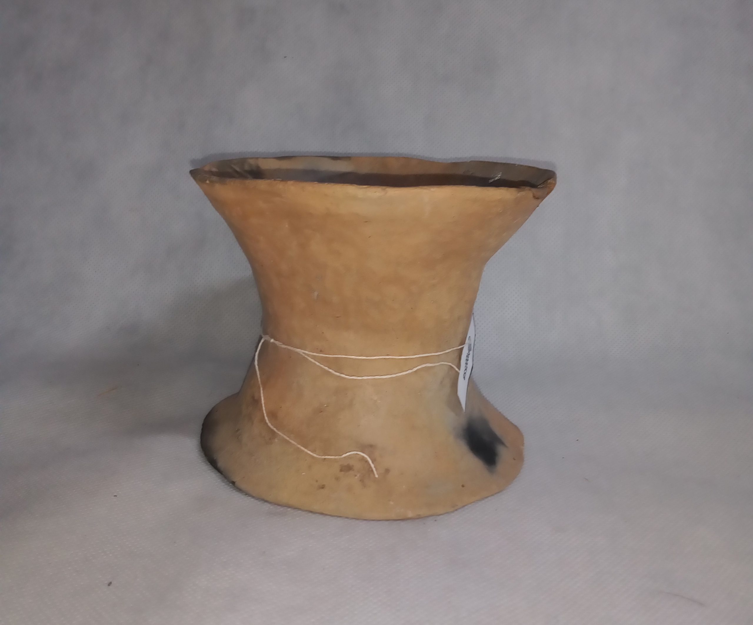Suporte em cerâmica usado para equilibrar a panela ao lume. Trempe vasado em forma de ampulheta. Apresenta manchas provocadas pelo cozimento. Achas de lenha são colocadas entre as trempes que sustentam a panela. Relação com os objetos MPI0055 e MPI0055A.