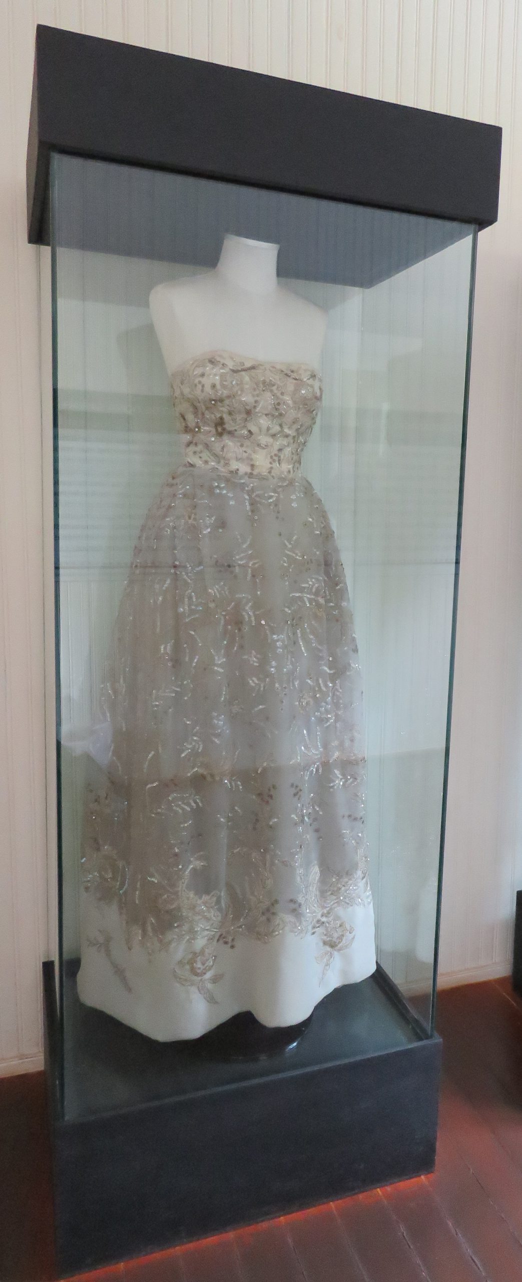 Vestido de festa longo sem alças, com forro branco e tecido com transparência bordado com motivos de flores e folhas por toda sua extensão com exceção da barra. Bordados em linha dourada e aplicação de lantejoulas redondas e em formato de flor.