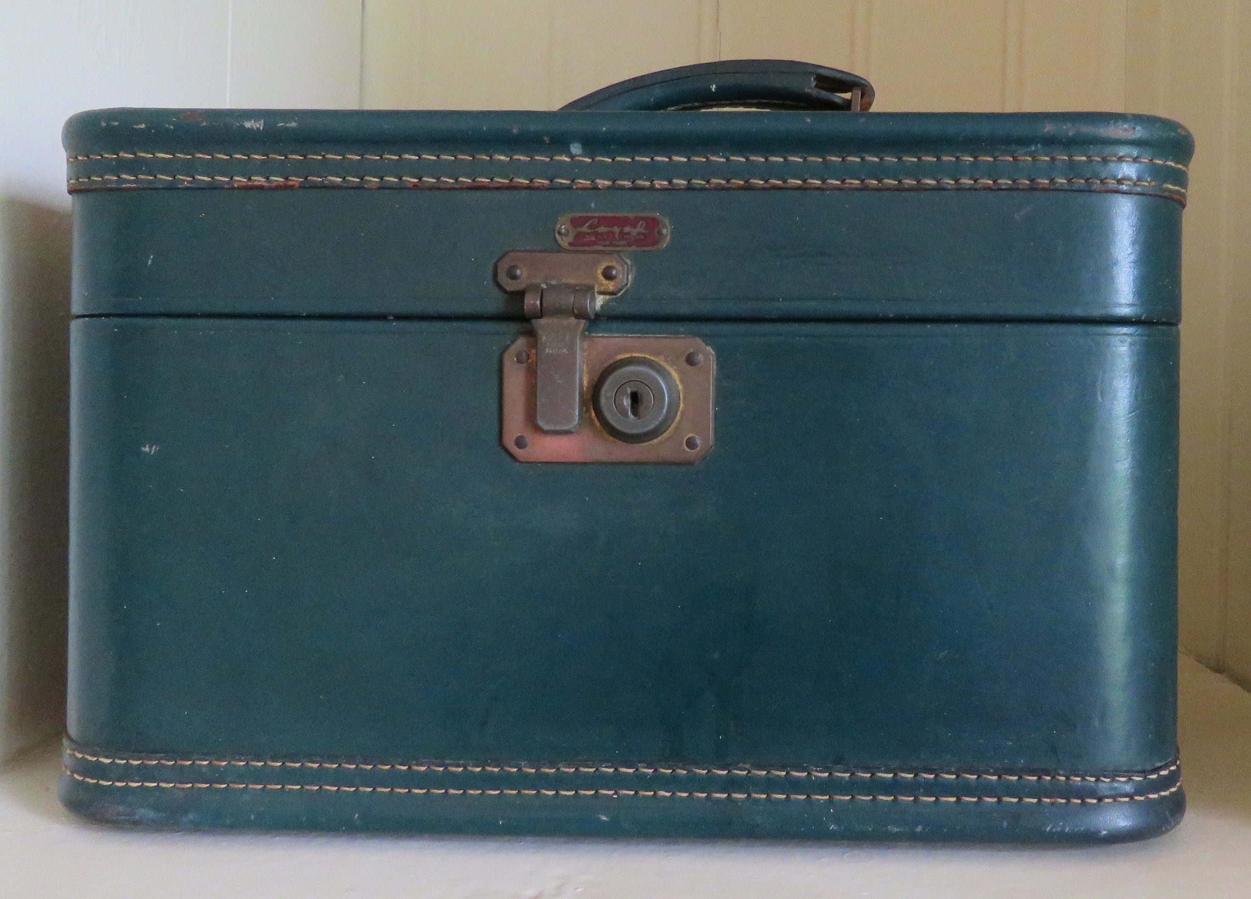 Maleta em couro sintético verde da marca Loyal NY. Retangular com as costuras brancas, alça em couro sintético verde e suporte em metal, fecho, dobradiças e quatro pés em metal. Supostamente utilizada por dona Coracy Pinheiro quando viajava.